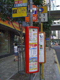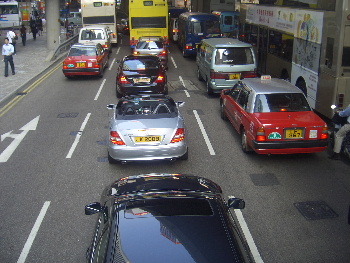 バスの前に停車中の車はベンツetc、タクシー(的士)はトヨタ。香港社会