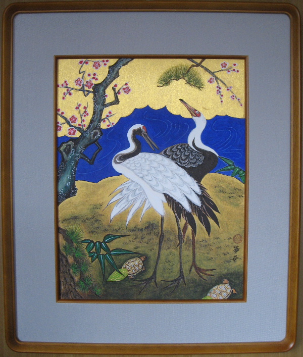 お正月に玄関に飾る縁起物にと、水墨に彩色して、鶴亀と松竹梅です